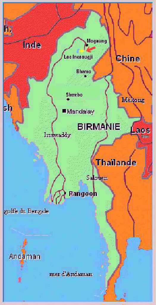 "Le Temple de Lao-Tsun est incontestablement une des curieuses merveilles de l'lnde que de bien rares mortels ont été appelés à contempler. Situé à l'est du Lac Incaougji, entre Mogaung et Shwebo, dans une région quasi désertique, entouré de barrières aux murs infranchissables. (Cliquer sur la carte pour agrandir). Là vivaient encore en 1898, les derniers Kittahs et il me fut permis de les observer quelque peu avec leurs animaux sacrés. A la suite de rébellion et lors de l'occupation Anglaise de la base de Bahmo, base très isolée en raison de son éloignement de Mandalay, nous eûmes à protéger les Kittahs contre une invasion Brahmanique et nous les sauvâmes d'un massacre et d'un pillage certains. Leur Lahma Kittah, le Yotag ROOH-OUGJI me reçut et me fit présent d'une plaquette représentant le Chat Sacré de Birmanie aux pieds d'une déesse bizarre, dont les yeux sont faits de deux saphirs allongés (pièces 4108 de ma collection de Mildenhall) après m'avoir, faveur insigno, permis de contempler les Chats Sacrés au nombre d'une centaine".