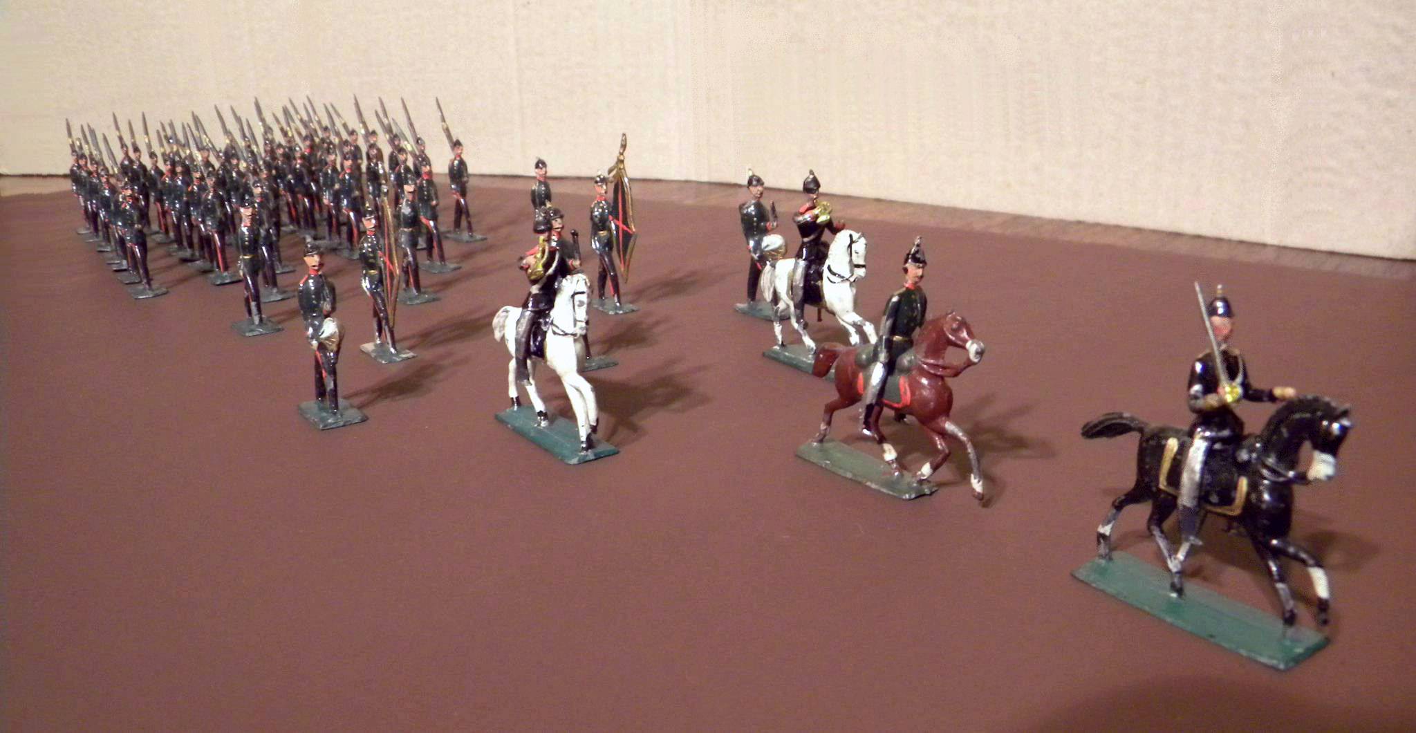 1 escorte de 5 cavaliers chevaux bruns. 1 Officier à cheval (beige) | 1 cavalier conducteur | | |