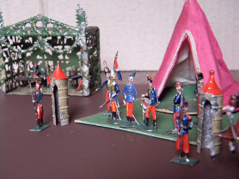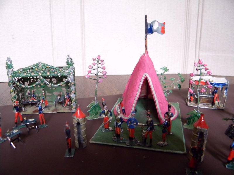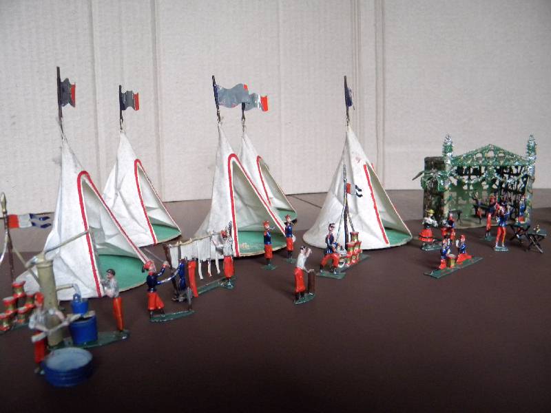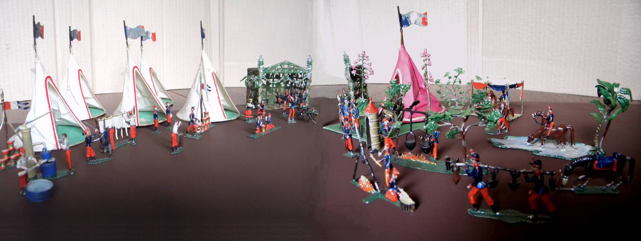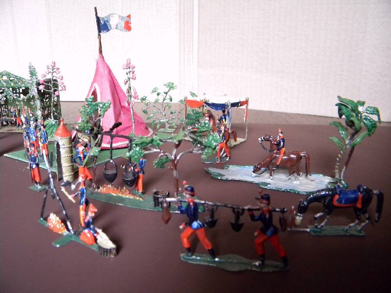 Avertissement : L'auteur de cette page n'a aucune expérience au niveau des connaissances et évaluations concernant ces merveilleux jouets historiques. Tous les noms qu'il donne ici, ont été trouvés à l'aide de l'excellent livre de Christian Blondieau (Long Chris, salut ! ) "Collection CBG-Mignot" que tous les collectionneurs doivent avoir, et nous attendons vos confirmations. Merci à ceux qui ont déjà participé ! Pour ma part, j'y ai découvert que la première série date de 1883, la seconde de 1909, la troisième d'après la 1ere guerre. Il y a trois tailles 30 mm (1), 40 mm (2) et 50 mm (3) à hauteur d'homme, et trois épaisseurs: plates, demi-rondes et rondes (pleins ou creux). Le pied appelé "terrasse" est aussi un indicateur de type de série. Le magasin de vente de Paris existe toujours et des ré-éditions de séries (et même de présentoirs vides ! ) sont toujours disponibles. Pour le reste, voir l' "historique" ci-dessous: ce sont des originaux, ils s'adressent à des connaisseurs. A part le "campement" ci-dessous, plus ancien, ce sont tous des CBG-Mignot 1ere série, taille 2 demi-ronde, terrasse verte, donc 1883. Ils ne sont évidemment pas neuf mais en excellent état de conservation. Pas de restauration pratiquée, sauf une roue de charrette, pas de boites d'origines en notre possession, conservées en boites blanches avec un fac-similé de l'étiquette CBG. La totalité de la collection, héritée d'un papy centenaire, a été vendue en 2009.